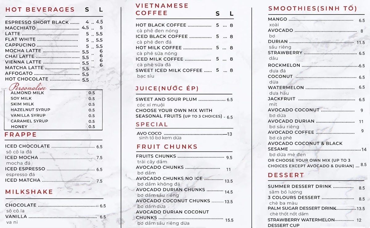 The menu at Canley Heights Corner Cafe is centered around a variety of hot beverages, with a strong emphasis on Vietnamese coffee styles and classic cafe drinks. It is designed to cater to those looking for breakfast options, coffee breaks, or light snacks suitable for casual dining or quick orders.